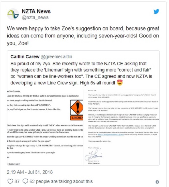 ونشرت كايتلين كاريو، والدة الطفلة، تغريدة على تويتر تروي قضة العمل البارع الذي قامت به ابنتها، وكتبت الأم في تغريدتها: “فخورة للغاية بابنتي 7 أعوام. لقد كتبت خطاباً للرئيس التنفيذي لهيئة النقل النيوزيلندية لتطلب تغيير لافتة “لاين مان” (عامل الخطوط) بأخرى أكثر صواباً وعدلاً، لأن النساء يمكن أيضاً أن يكنَّ عاملات خطوط “، في إشارة إلى العمال المعنيين بالتعامل مع أسلاك الكهرباء والهواتف وغيرها في الشوارع.