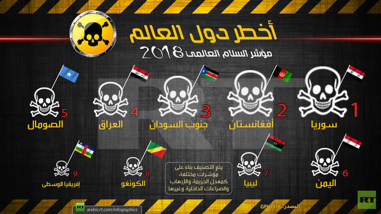 وحلت سوريا في المرتبة الأخيرة، وبالتالي هي “أخطر دولة في العالم”. (RT)