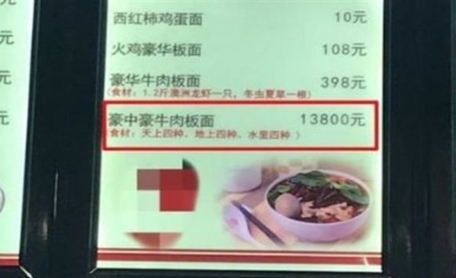 وتداولت مواقع التواصل الاجتماعي صورة لقائمة الطعام في مطعم نيو جينتان، بمدينة شيجياتشوانغ، يظهر فيها حساء المعكرونة، الذي تصل قيمته إلى 13.800 يوان (2014 دولار)، أي ما يزيد عن ثمن بقرة.