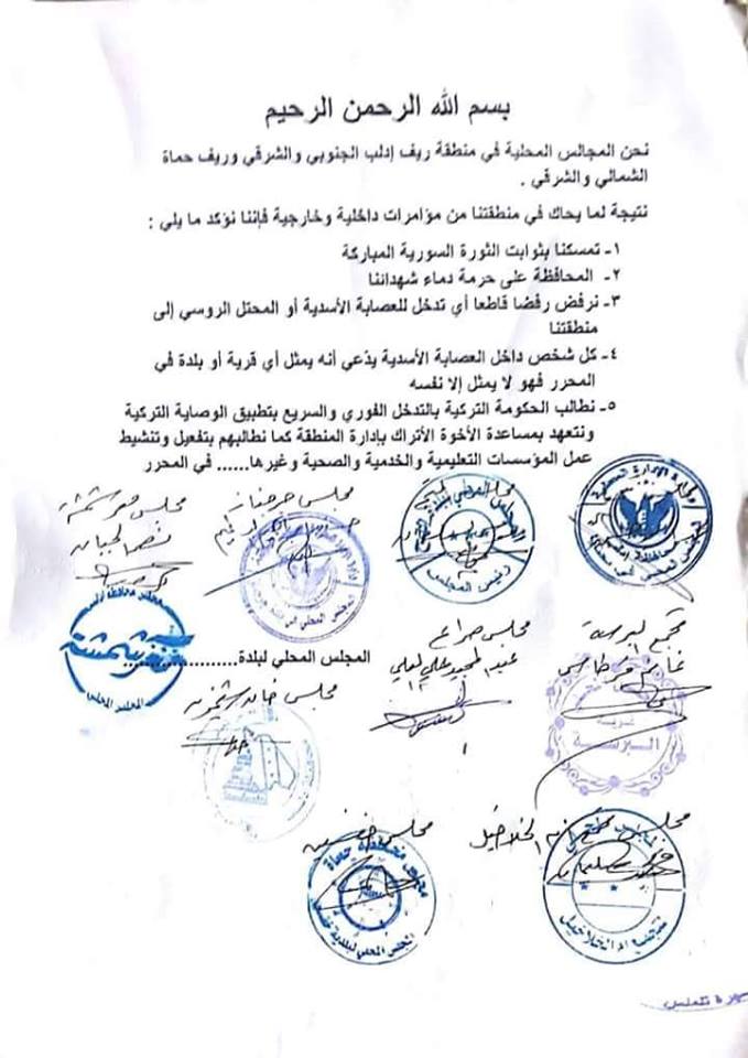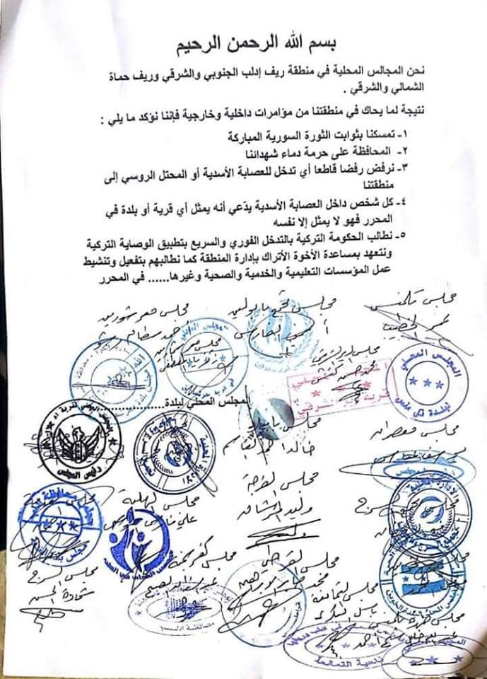 وتناقل ناشطون بياناً للمجالس المحلية في منطقة ريف إدلب الجنوبي والشرقي وريف حماة الشمالي والشرقي، ترفض فيه دخول النظام أو روسيا إلى تلك المناطق، وتطالب تركيا بالتدخل الفوري وتطبيق الوصاية التركية.