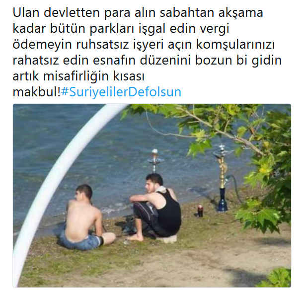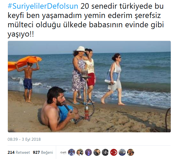 واستخدم الأتراك الوسم لنشر صور زعموا أنها لسوريين يدخنون الشيشة على الشواطئ التركية، حيث علق أحد المغردين قائلاً: “أعيش في تركيا منذ 20 عاماً ولم أتمكن من الاستمتاع بهذا الشكل، اللاجئون عديمو الشرف يعيشون (في تركيا) كما لو أنهم يعيشون في منزل والدهم”.