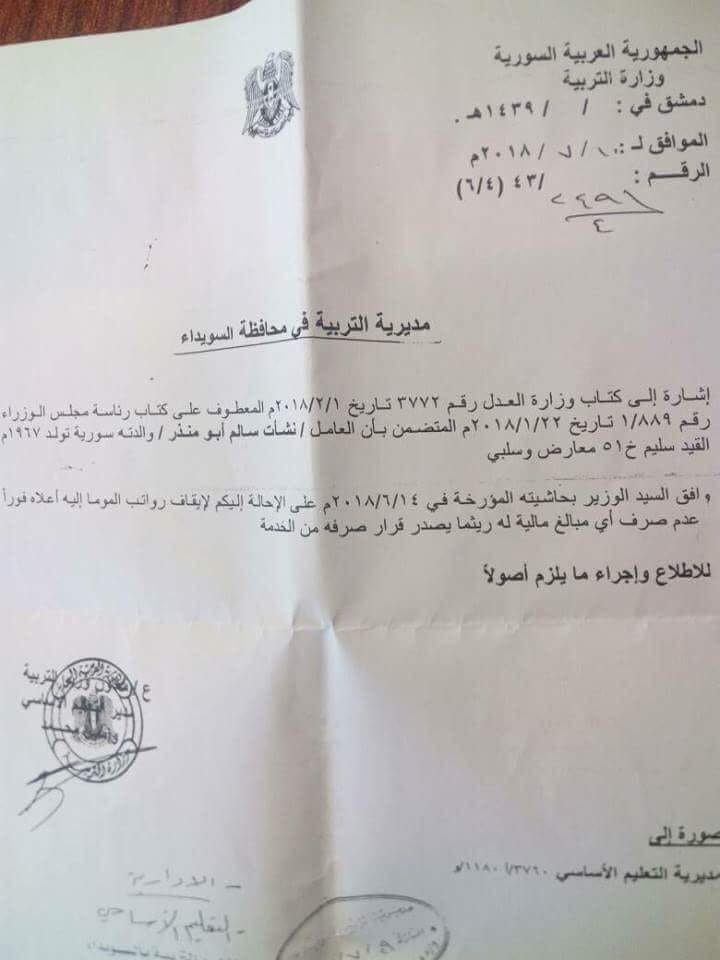 ونقلت القناة عن مصادر إعلامية محلية موالية أن “الموظف نشأت أبو منذر العامل في مديرية التعليم الأساسي بالسويداء فوجئ بقرار صادر عن معاون وزير التربية القاضي بوقف راتبه، وعدم صرف أي مبالغ مالية له، ريثما يتم صرفه من الخدمة، بدون أي تحقيق أو استقصاء أو إنذار مسبق، بحجة أنه “معارض سلبي”.