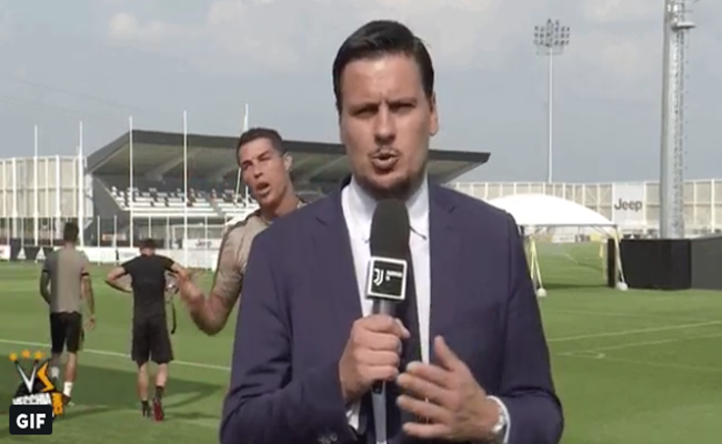 وقف رونالدو خلف مذيع تلفزيون يوفنتوس وبدأ يقلد حركاته بأسلوب ساخر، ثم تركه وعاد إلى ملعب التدريبات، ويبدو أن المذيع لم يلاحظ ما يحدث خلفه، وواصل عمله بشكل طبيعي.