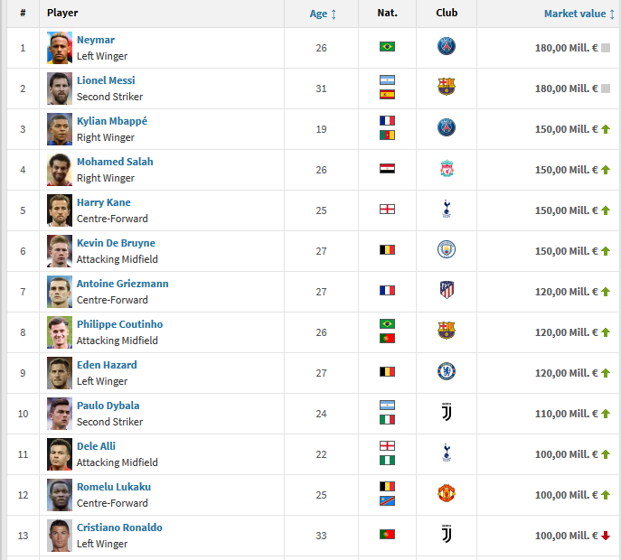 ووفقا للموقع الألماني، يحتل محمد صلاح المركز الرابع في قائمة أغلى لاعبي العالم بعد البرازيلي نيمار والأرجنتيني ليونيل ميسي والفرنسي كليان مبابي.