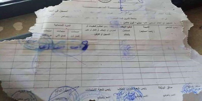 ونشر أحد طلاب الهندسة البحرية في جامعة تشرين على صفحته الشخصية على فيسبوك، صورة لوثيقة حياته الجامعية، وقد أكل عليها الدهر وشرب، حيث لوحظ الحبر وقد انحل، وأطراف الورقة مأكولة من قبل الفئران، بشكل يصعب على حاملها فهم ما فيها.