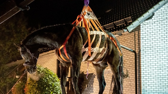 وقامت إدارة الاطفاء بإخراج الحصان برافعة، وتبين أنه لم يصب بأذى، في حين أن حجم الأضرار بسقف المرآب بلغت حوالي 1300 يورو.