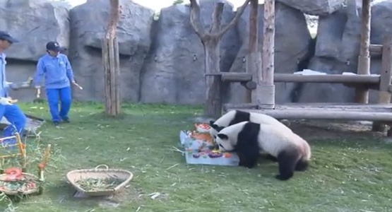 احتفلت حديقة حيوان صينية بعيد ميلاد اثنين من دببة الباندا بحضور زوار وصحفيين.