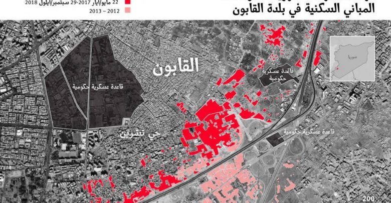 وقالت “هيومن رايتس ووتش” إنها “حلّلت صوراً من الأقمار الصناعية لأحياء القابون”، موضحة أنها “تظهر عمليات هدم واسعة النطاق بدأت في أواخر مايو/ أيار 2017، بعد انتهاء القتال هناك، تؤكد الصور أن عمليات الهدم ما زالت مستمرة”.