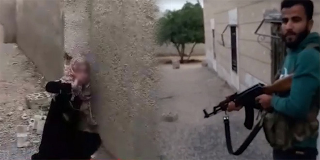 وأظهر الفيديو شاباً يدعى (بحسب المصور) بشار بسيس، وهو يحمل سلاحاً ويوجهه صوب فتاة جاثية بالقرب من جدار.