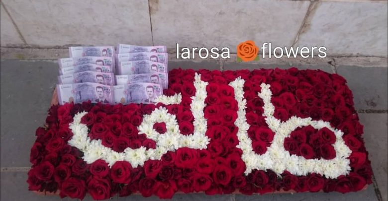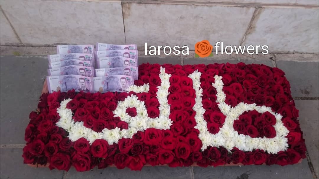 وأظهرت الصور التي نشرها المتجر عبر صفحته، مجموعة من الورود الحمراء والبيضاء المشكلة لكلمة “طالق” وقد وضع عليها أوراق نقدية من فئة 2000 ليرة.