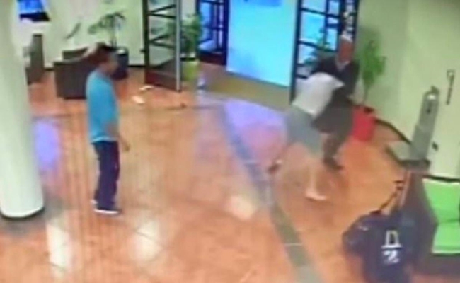 رصدت كاميرات المراقبة في فندق إسباني لحظة مثيرة عندما هَمّ سائح بريطاني بمهاجمة زوجته في ردهة الفندق، وسارع مدير الفندق الذي تصادف وجوده إلى التدخل لحماية المرأة وتبادل اللكمات مع الزوج الهائج وأوقعه أرضا.