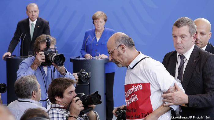 نفت إدارة الهجرة وشؤون الأجانب في مدينة هامبورغ الاثنين، نيتها ترحيل صحافي تركي ارتدى قميصا عليه شعار ينادي بالحرية للإعلاميين الاشتراك خلال مؤتمر صحافي مشترك بين الرئيس التركي رجب طيب أردوغان والمستشارة الألمانية أنغيلا ميركل.
