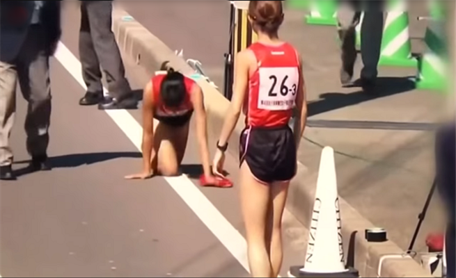 متسابقة يابانية تكمل الماراثون بعد أن كسرت ساقها ! ( فيديو )