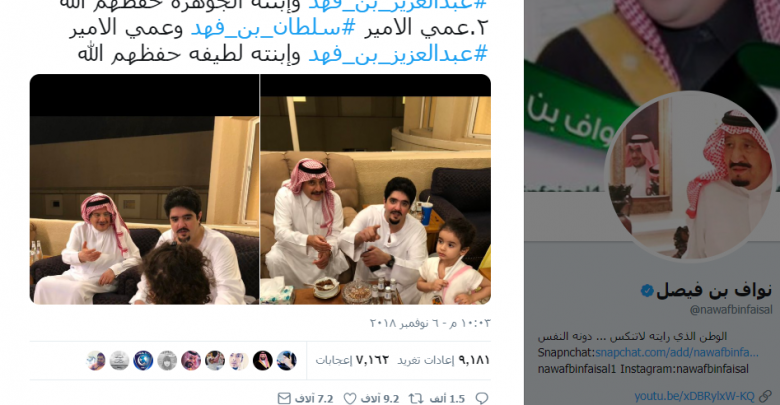 وأظهرت الصور التي نشرها الأمير نواف على “تويتر”، الأمير عبد العزيز برفقة ابنتيه، كما ظهر معه أخواه الأمير سلطان والأمير محمد بن فهد، بعد أيام من عودة الأمير أحمد بن عبد العزيز من مقر إقامته في أوروبا.