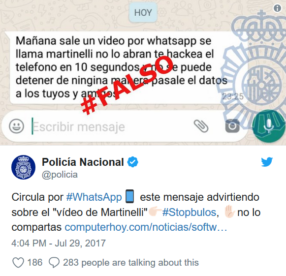 وتحذر الخدعة من فتح شريط فيديو يظهر في تطبيق واتس آب باسم “martinelli”، وتطلب من المستخدمين نشر التحذير قدر الإمكان.
