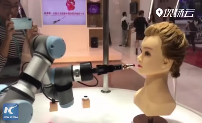 ويظهر تسجيل مصور تم تصويره في المعرض الذي أقيم في شنغهاي، ذراع الروبوت وهي تضع المكياج على نموذج اصطناعي لرأس أنثى، وتستخدم الماسكرا ومستحضرات التجميل المختلفة على الوجه الاصطناعي.