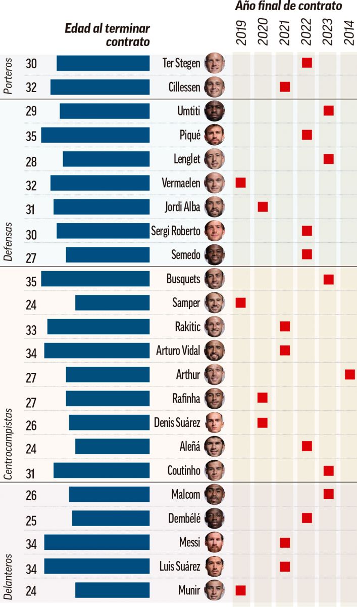 هذا وتكشف العقود الحالية للاعبي الفريق الكتالوني بأنها ستنقضي وقد تجاوز أغلبهم سن الثلاثين عاماً، مما يجعلهم يعتزلون كرة القدم او ينتقلون للعب إلى خارج أوروبا سواء الخليج العربي أو اليابان أو الولايات المتحدة الأميركية.
