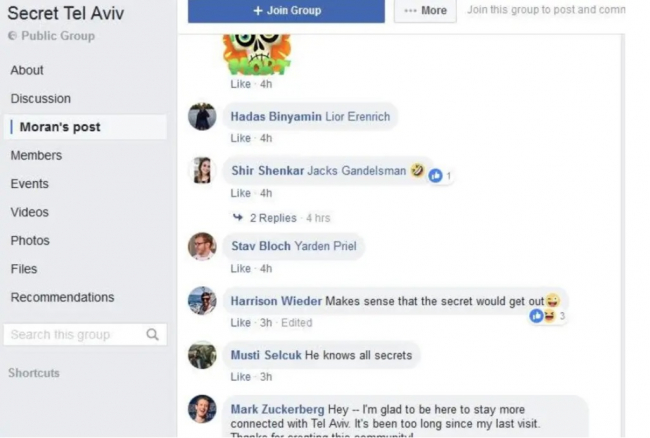 وقالت صحيفة “جيروسالم بوست” الإسرائيلية إن المجموعة تدعى “تل أبيب السرية” وتضم 220 ألف عضو، مشيرة إلى أن زوكربرغ انضم لها الأسبوع الماضي.