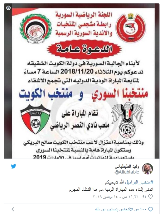 تغريدة الطبطبائي جاءت في تعليق على منشور للجنة الرياضية السورية، دعت فيها أبناء الجالية السورية في الكويت لمتابعة المباراة الودية التي ستقام في الـ20 من الشهر الجاري على ملعب نادي النصر الرياضي.