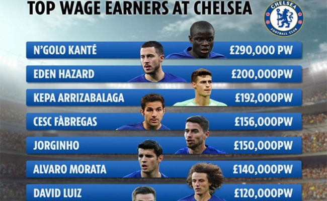 وتجاوز كانتي الراتب الذي يحصل عليه نجم الوسط البلجيكي إدين هازارد ، إذ يتقاضى الأخير راتباً اسبوعياً يقدر بـ 200 الف جنيه استرليني ، وهو الراتب المرشح ليتجاوز سقف الـ 300 الف جنيه اسبوعياً في حال مدد الدولي البلجيكي عقده مع النادي ، علماً ان عقده الحالي ينقضي في شهر يونيو من عام 2020 ، مع الإشارة الى أنه لم يقرر مستقبله حتى الآن سواء بالبقاء أو تغيير الأجواء والانتقال لأحد الأندية الأوروبية الكبيرة.