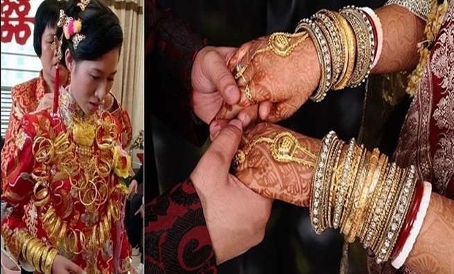 قام رجل آسيوي بإهداء عروسه قطعاً كثيرة من الذهب تُعادل وزنها.