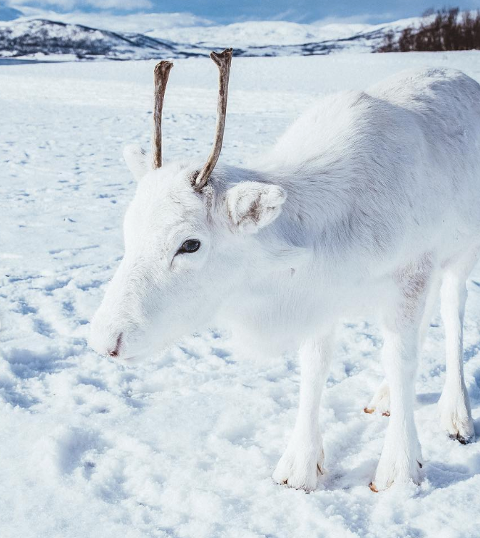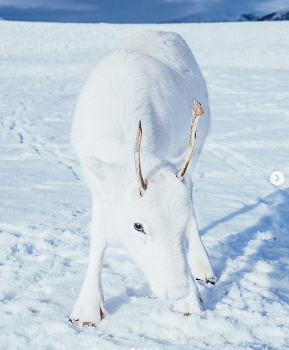 وبحسب ما ذكرت قناة “سكاي نيوز”، تعد الرنة البيضاء من أندر أنواع الحيوانات، وتتواجد في المناطق الشمالية للأرض، أما لونها المميز فناجم عن طفرات جينية تجعلها بيضاء ناصعة كلون الثلج.
