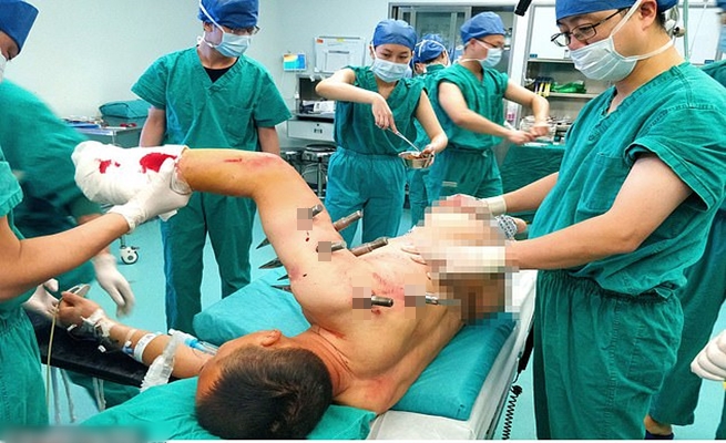 وصدم الصيني “تشو” الأطباء عندما نُقل إلى المستشفى بـ10 قضبان معدنية منغرسة في جسمه بعد حادث مروع في مصنع.