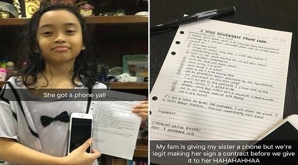 اضطرت فتاة تبلغ من العمر 10 سنوات لتوقيع عقد مع والديها يتضمن مجموعة من الشروط القاسية، بعد أن طلبت الحصول على هاتف آي فون.