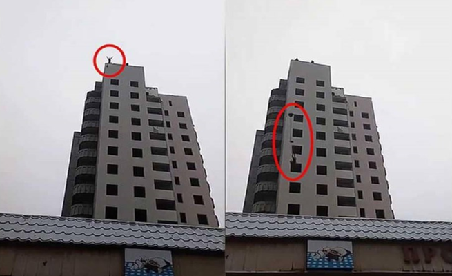ورصد المقطع الطفل وهو يستعد للقفز من الطابق الـ14 لبناية في مدينة ماكيفكا الأوكرانية، فيما كان عدد من الناس، من بينهم والدته، في الأسفل يصورون المشهد بهواتفهم.