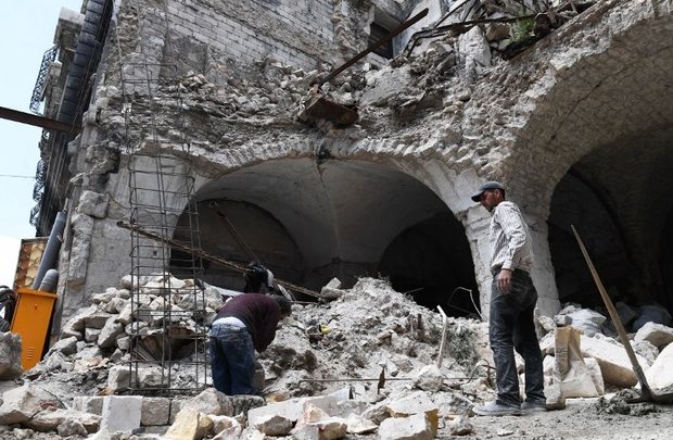 واليوم، لا تجري أية عمليات ترميم رسمية إلا في جامع حلب الكبير، وهو مشروع بارز يموّله رئيس الشيشان، أحد أصدقاء بوتين، وأُعِيد بالفعل ترميم غالبية الكنائس والكاتدرائيات الموجودة في المدينة، بفضل القساوسة والبطاركة المقربين من النظام السوري الذين يتمتعون بدوائر معارف واسعة، ووجدت أموالٌ من مانحين مسيحيين أثرياء طريقاً للتدفق إلى داخل سوريا بطريقةٍ ما، بالرغم من العقوبات الاقتصادية المفروضة عليها.
