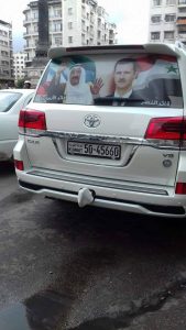 وتابعت: “وصل إلى العاصمة دمشق أحد الوافدين من دولة الكويت بسيارته عن طريق البر، وبالتأكيد عبر الحدود الأردنية السورية التي أصبح بالإمكان العبور من خلالها بعد افتتاح معبر جابر نصيب الحدودي بين الأردن وسوريا، ورفع الوافد على سيارته التي تحمل لوحة كويتية، صورة كبيرة على كامل الزجاج الخلفي للسيارة، ظهر فيها الرئيس الأسد مكتوب تحتها عبارة قائد النصر، وصورة أمير الكويت حيث كتب الوافد عبارة قائد الإنسانية”.