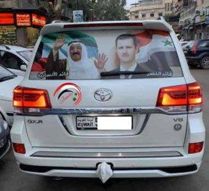 وتابعت: “وصل إلى العاصمة دمشق أحد الوافدين من دولة الكويت بسيارته عن طريق البر، وبالتأكيد عبر الحدود الأردنية السورية التي أصبح بالإمكان العبور من خلالها بعد افتتاح معبر جابر نصيب الحدودي بين الأردن وسوريا، ورفع الوافد على سيارته التي تحمل لوحة كويتية، صورة كبيرة على كامل الزجاج الخلفي للسيارة، ظهر فيها الرئيس الأسد مكتوب تحتها عبارة قائد النصر، وصورة أمير الكويت حيث كتب الوافد عبارة قائد الإنسانية”.