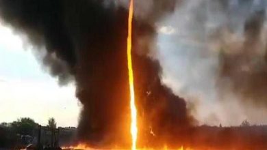 إعصار ناري يمتد من الأرض للسماء في مشهد نادر ( فيديو )
