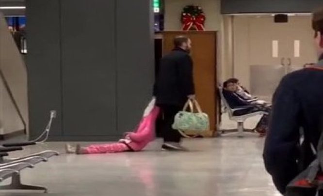 أب أمريكي يجر ابنته من معطفها على أرضية المطار ! ( فيديو )
