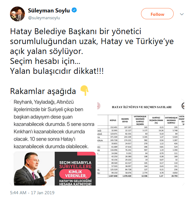 نفى وزير الداخلية التركي “سليمان صويلو” بالأرقام مزاعم رئيس بلدية محافظة هاتاي الكبرى “لطفي صافاش” بأن السوريين باتوا قادرين على الفوز بالانتخابات المحلية في بعض المقاطعات إذا ما تمكنوا من ترشيح أنفسهم.