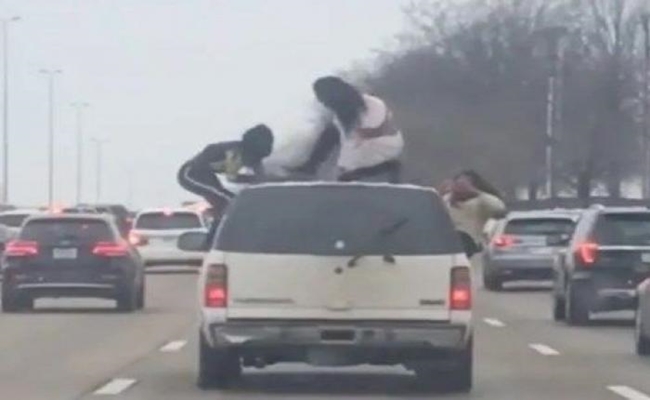 التقط سائق سيارة تسجيلاً مصوراً لامرأتين وهما تمارسان الرقص على سطح سيارة تسير بسرعة على طريق سريع في ولاية ميزوري الأمريكية.