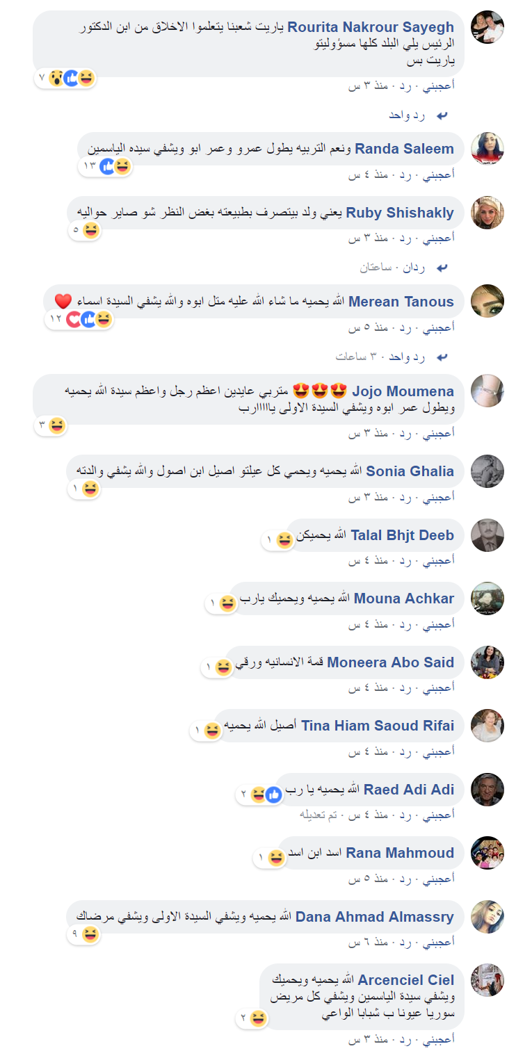 وتم تناقل المنشور على نحو واسع في الأوساط الموالية، وعبر المعلقون عليه عن إعجابهم بـ “تواضع ولطافة وأخلاق وإنسانية” نجل الرئيس، ودعوا بالشفاء لوالدته.