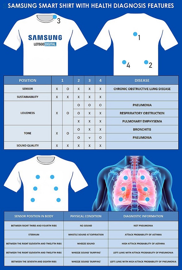 طورت شركة #سامسونغ قميصاً ذكياً قادراً على تشخيص أمراض الجهاز التنفسي والرئة مثل الربو، والالتهاب الرئوي، والتهاب الشعب الهوائية وغيرها، بفضل دمجه بمجموعة متنوعة من المستشعرات الدقيقة لتحليل الأصوات الصادرة عند التنفس وقياس قوة وشدة الشهيق والزفير، لتشخيص المرض.
