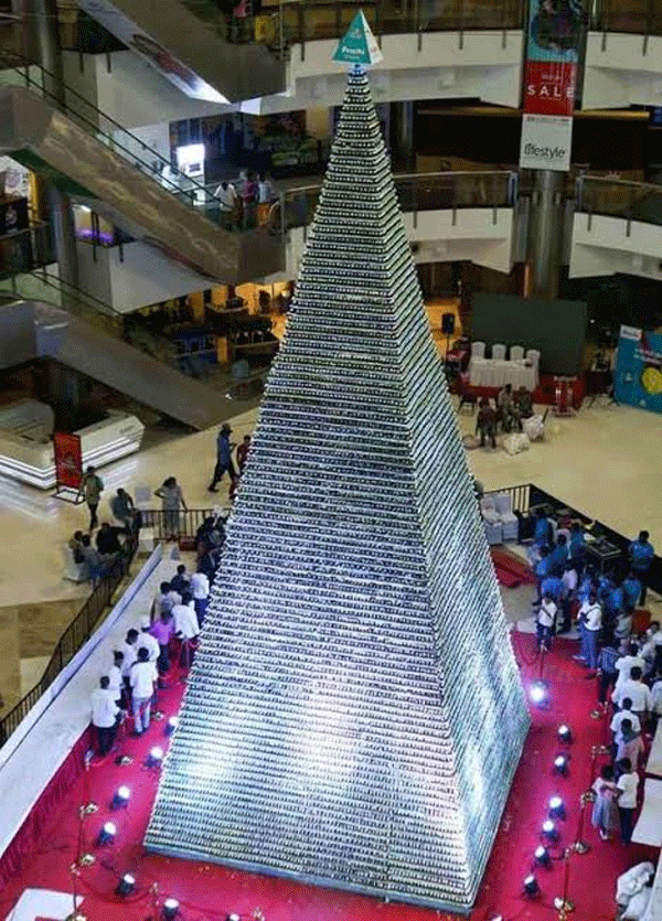 وبحسب ما نقلت شبكة “إرم نيوز” عن وكالة ” يونايتد برس إنترناشيونال” الأمريكية، تم إنشاء البرج بشكل هرمي في المركز التجاري “فوروم فيجايا”، في مدينة تشيناي، وبالإضافة إلى ارتفاعه الهائل، تكون تصميمه من 18818 قطعة “كب كيك”.