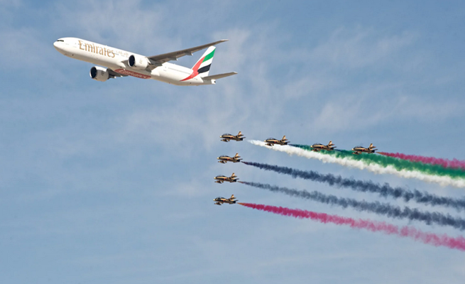 وشكلت الطائرات خلال العرض رسالة تقول: “شكرا لك، الشيخ محمد” بالإضافة إلى 11 شكلا مختلفا.