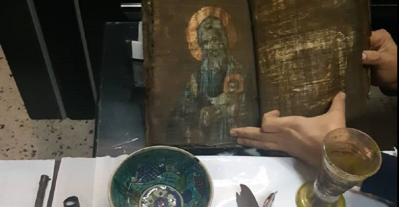 وذكرت الوكالة أن “قوى الأمن الجنائي السورية تمكنت من الإيقاع بعصابة إجرامية في منطقة الصنمين بمحافظة درعا، تقوم بالتنقيب في المواقع الأثرية، وقد استخرجت العديد من الكنوز الأثرية والتحف والتماثيل والنقود الرومانية والبيزنطية والإسلامية إضافة إلى مادة الزئبق الأحمر النادرة والنفيسة، ونسخة بيزنطية من الإنجيل المقدس تحوي على أيقونات للسيد المسيح والسيدة العذراء وللرسل القديسين”.