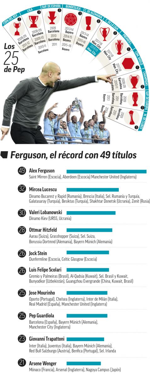 وفي التفاصيل بحسب ما اوردت صحيفة “إيلاف”، فقد أحرز غوارديولا مع برشلونة 14 لقباً، بينما نال مع بايرن ميونيخ 7 ألقاب ، أما مانشستر سيتي الذي يدربه منذ صيف عام 2016 فقد حقق معه اربعة ألقاب ليصل رصيده الإجمالي إلى 25 لقباً في مختلف البطولات المحلية والقارية والدولية.