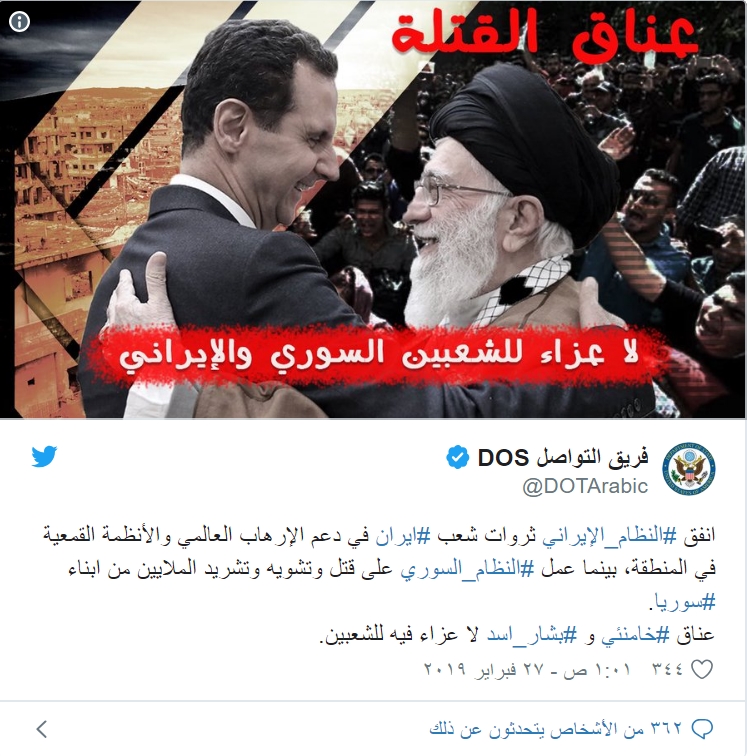 شرت فريق التواصل التابع لوزارة الخارجية الأمريكية، صورة تظهر عناق المرشد الأعلى لإيران، علي خامنئي وبشار الأسد، خلال الزيارة التي قام بها الأخير لطهران.