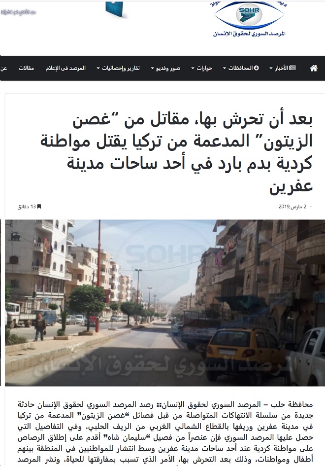 وذكر المرصد أن العنصر “أ قد م على إ طلا ق ا لر صا ص على مواطنة كردية عند أحد ساحات مدينة عفرين وسط انتشار للمواطنيين في المنطقة بينهم أطفال ومواطنات، وذلك بعد ا لتحر ش بها، الأمر الذي تسبب بمفار قتها للحياة”.