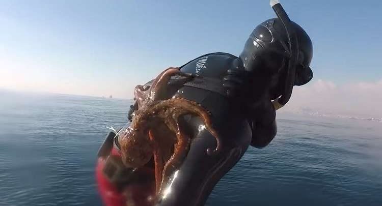 استمرت معركة غريبة من نوعها بين غواص إيطالي وأخطبوط تمسك بظهره، ثلاث دقائق كاملة، حاول فيها الغواص التخلص من أذرع الأخطبوط العنيد.