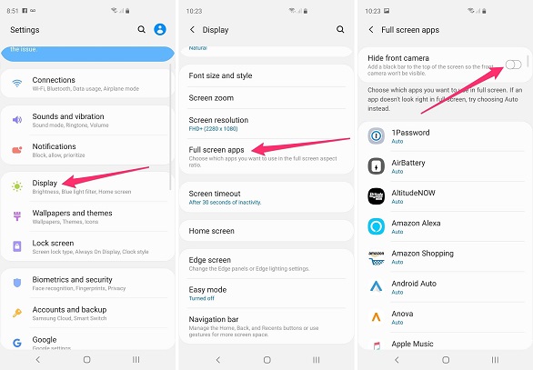 فقط الذهاب إلى “اعدادات (Settings”) ثم “الشاشة” (Display) ثم النقر على خيار “Full Screen apps” ثم النقر على خيار “إخفاء الكاميرا الأمامية” (Hide front camera).