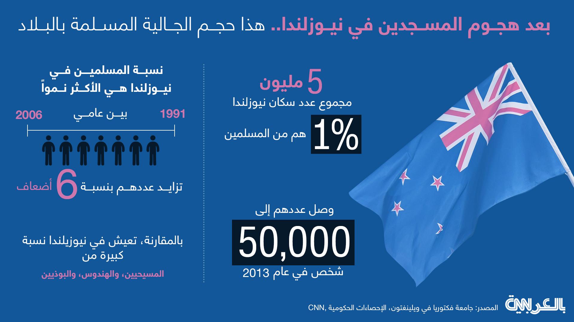 %1 من عدد سكان نيوزلندا، الـ5 ملايين، هم من المسلمين، وفقا للإحصائيات الحكومية، وقد وصل عددهم إلى 50 ألف شخص في عام 2013.