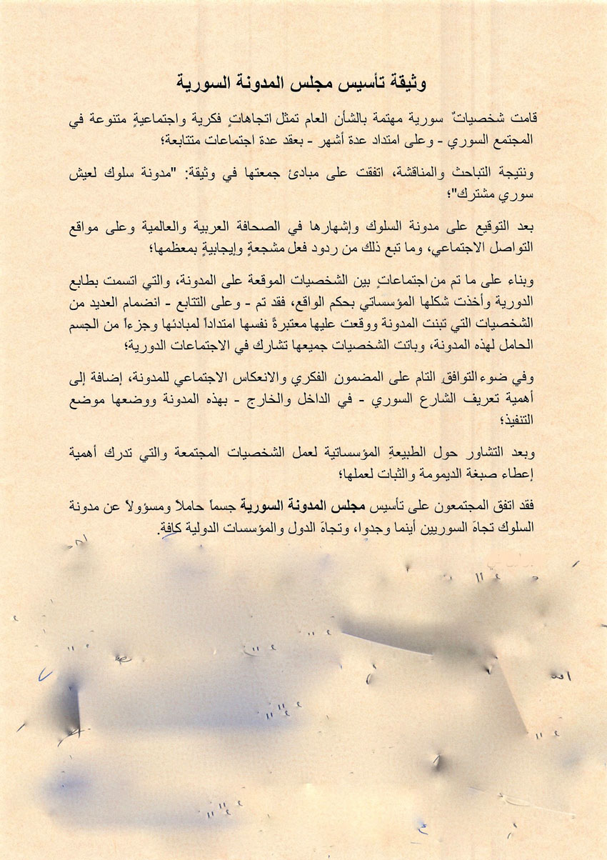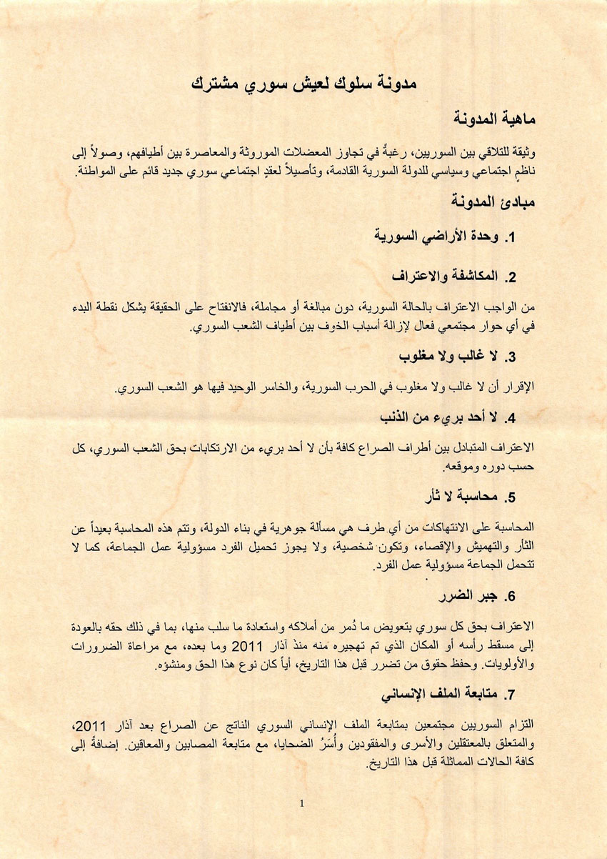 بعد أكثر من سنتين من الحوار السري بين شخصيات ممثلة للمكونات السورية داخل البلاد وخارجها خصوصاً من العلويين والسنة، قرر المتحاورون الخروج إلى العلن بـ«مدونة سلوك لعيش سوري مشترك» تكون بمثابة مبادئ فوق دستورية، وتأسيس «مجلس المدونة السورية»، على أمل الحصول على دعم اجتماعي لهما. وتنشر «الشرق الأوسط» نص الوثيقتين ومضمون الجلسة الأخيرة من الحوار.