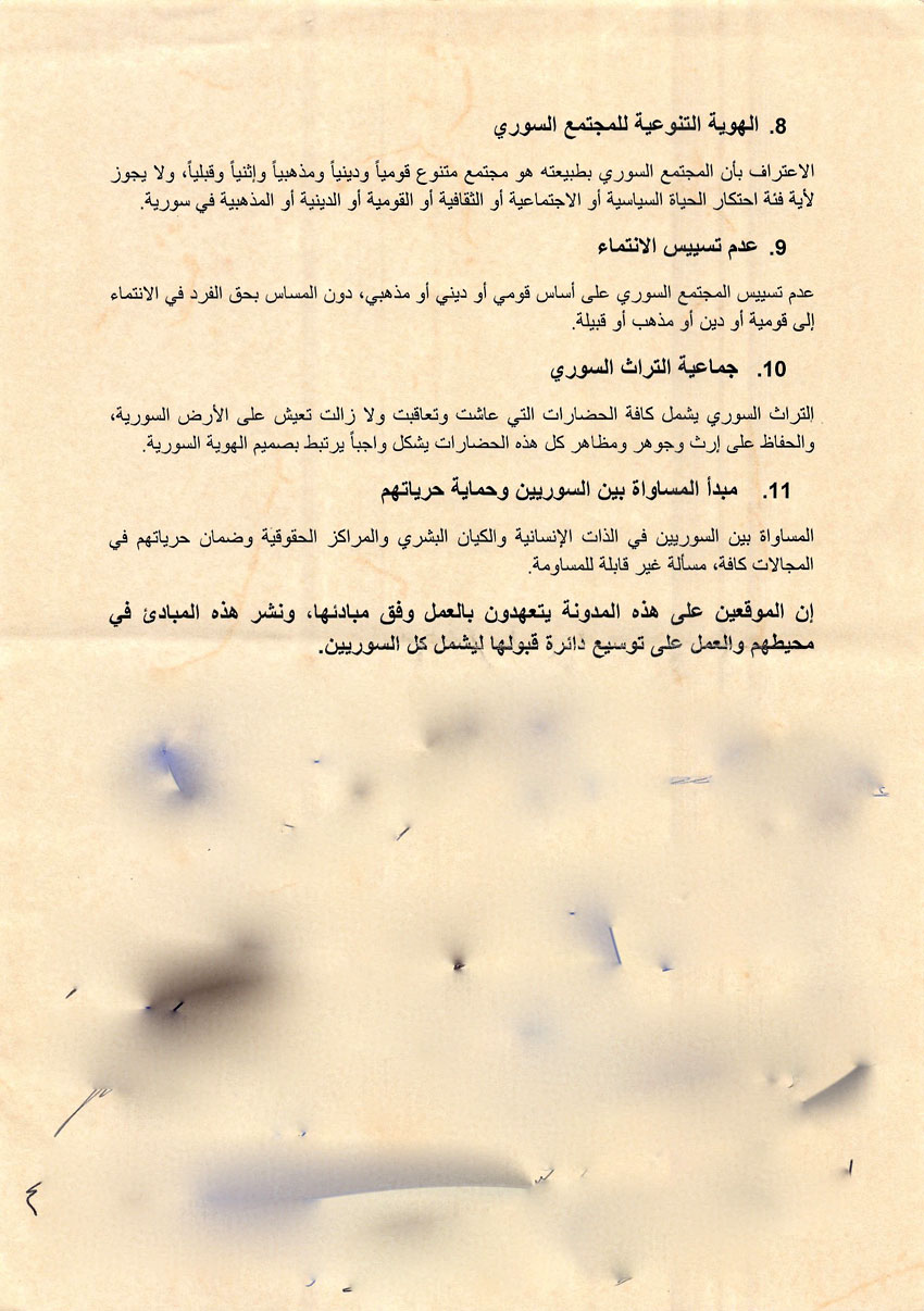 في هذا الاعلان يوجد بنود جيدة جدا كالبند رقم 8 و 9 و 11 . هل لي أن أسألكم أيها السادة ماهي الحلول التي في جعبتكم من أجل إنهاء هذه الحالة من اللاحرب واللاسلم القاتلة التي يعيشها نصف الشعب السوري في الداخل ونصفه الآخر في الخارج ؟ بعد قراءة تعليقيكما يخلص الانسان إلى نتيجة أن الوضع سيبقى على حاله حتى قيام الساعة . إني أتساءل هل بإمكان الانسان السوري أن يرقى بفكره الى مستوى الأمم ذات التاريخ الحافل بالحروب الطاحنة التي راح ضحيتها الملايين من البشر كالحرب العالمية الاولى التي جلست بعدها الاطراف المتحاربة كالالمان والفرنسيون واستطاعوا انهاء الخلافات حتى بعد شلالات الدماء في الحرب العالمية الثانية . كفانا يا ناس تنازلوا عن اسلوب التفكير الثأري القبائلي واستخدام المصطلحات التي لاتسمن ولاتغني من جوع مثل : الامور لاتحل ببوسة شوارب أو الاصرار على السباب والشتائم الطائفية التي ليس لها نتيجة سوى صب النار على الزيت والتي تدمر كل النوايا التي يمكن ان تؤدي إلى الخروج من هذا الجحيم الخانق.كلامي ليس موجه إلى طرف واحد فقط وإنما إلى كافة الاطراف فهل من من يسمع ؟