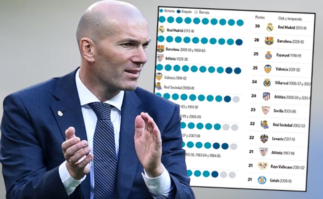 وبحسب ما اوردته صحيفة “ماركا” الإسبانية فإن ريال مدريد مع زيدان يُعد الفريق الوحيد الذي نجح بتحقيق العلامة الكاملة في الجولات العشر الأخيرة ببطولة الدوري الإسباني منذ تأسيسه عام 1928، وكان موسم (2015-2016) شاهداً على ذلك ، عندما تولي المدرب الفرنسي زين الدين زيدان مهام الإشراف الفني على الفريق المدريدي في اول مواسمه التدريبية .